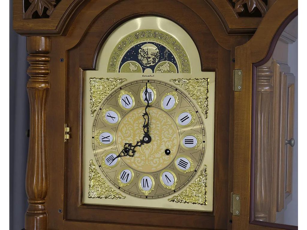 Задняя зеркальная стенка подчеркивает красоту маятника с декоративным диском и гирь из полированной латуни