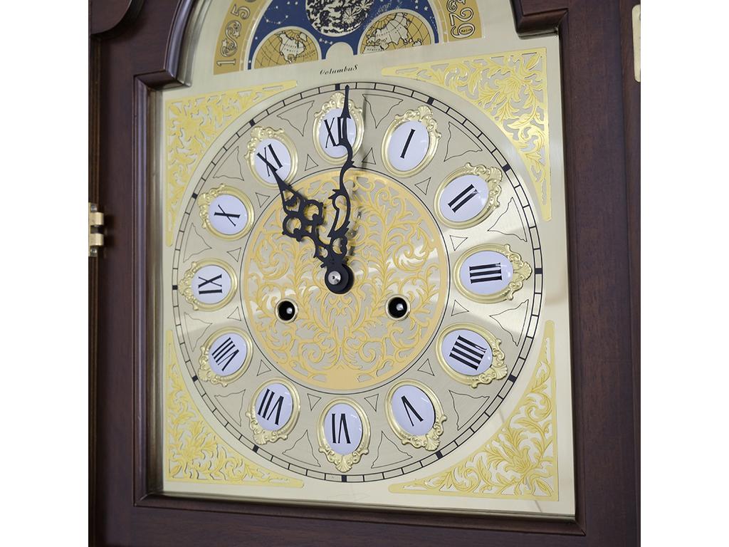 Часы напольные, механические. Фасад корпуса изготовлен из отборных пород твердого дерева. Корпус тонирован в цвет калифорнийская вишня. Централый диск циферблата, богато украшен высеченным, тончайшим узором из латуни. По углам - обьемные надсводные уголки, римские цифры циферблата, нанесены на отдельных, эмалированных чашечках в золотистых ложах. Позолоченные гири и маятник. Механизм пружинный с ручным заводом, бой на каждые полчаса и час, ручное отключение боя. Вес - 27 кг.
