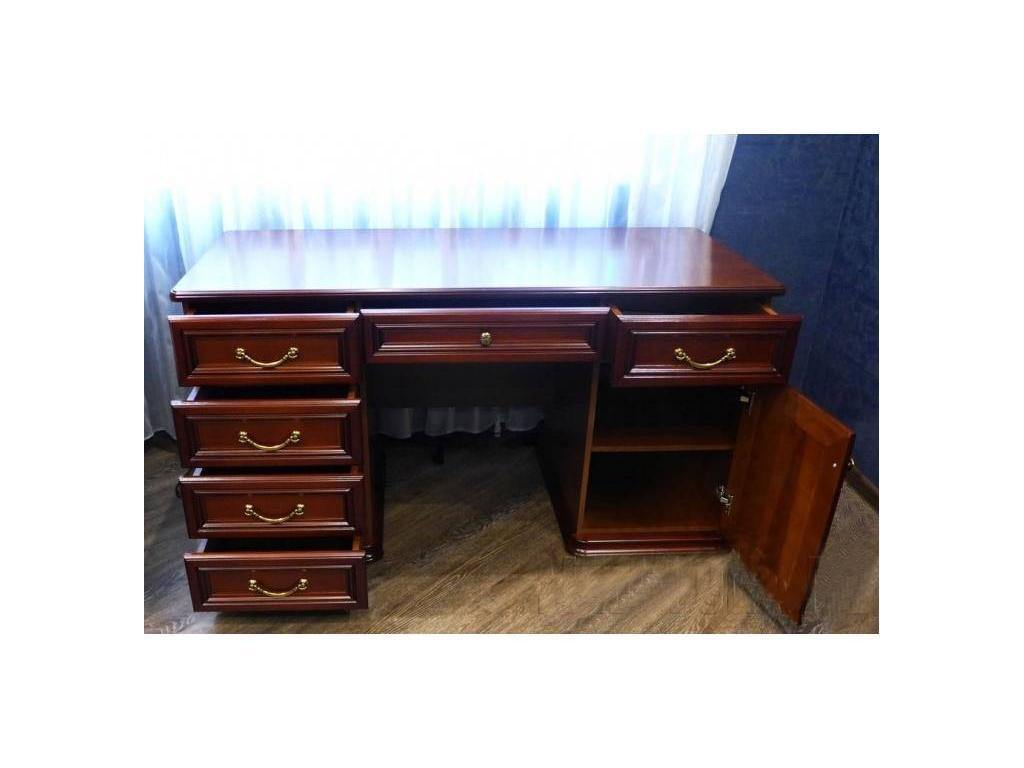 Требуется сборка. Стол двухтумбовый письменный предназначен для гостиной комнаты или домашнего кабинета. Внешний вид изделия позволяет отнести его к классическим предметам интерьера. Стол произведен по современным технологиям, гарантирующим долгий срок службы. Удобное и вместительное наполнение, шесть выдвижных ящиков и закрытая тумба с полкой. В стандартном варианте фасад выполнен в шпоне, а боковины ЛДСП, дополнительно можно заказать боковины в шпоне. Возможно исполнение в цвете: Белый ясень: зол.патина, Ноче Национале темн.патина, Орех Милано темн.патина.