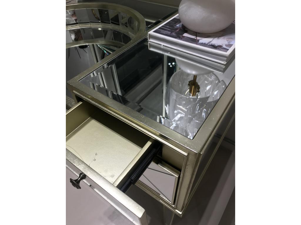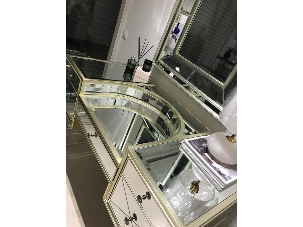 Зеркальный туалетный стол “Мелроуз” – сочетание функциональности и элегантности. Его зеркальная поверхность придает интерьеру лёгкость и визуальное расширение пространства, а пять вместительных ящиков обеспечивают удобное хранение косметики и аксессуаров. Столешница с полукруглым углублением создана для вашего комфорта, позволяя удобно расположить руки при выполнении утренних процедур. Материал: МДФ / Зеркало / Поталь. Кол-во ящиков: 5. Требуется сборка: Да. Вес 50 кг.