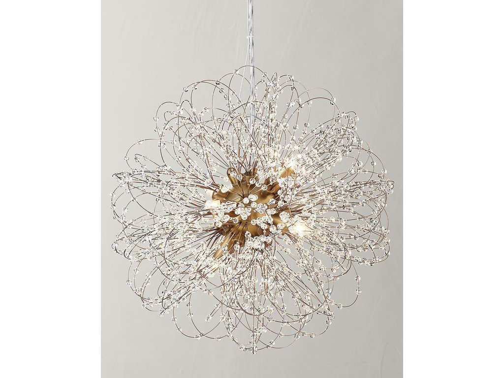 Золотая люстра “Нидали” вдохновлена природой и символизирует нежность и легкость одуванчика. Эта люстра обладает необычайной красотой и элегантностью благодаря своему дизайну. Изящные проволочные петли создают эффект легкости и плавности, напоминая растущие стебли одуванчика. Они блестяще завершены крошечными хрустальными бусинками, которые играют на свету и создают неповторимый мерцающий эффект. Особенностью этой люстры является ее способность создавать уникальную атмосферу в помещении. При освещении свет проникает сквозь бусинки, создавая мягкое и приятное освещение. Оно наполняет комнату теплотой и создает романтическую атмосферу. Длина цепи: 120 см. Длина провода: 140 см. Количество ламп: 9 шт. Тип цоколя: G9. Мощность лампы: 25 Вт. Степень защиты: IP20. Общая мощность: 225 Вт. Комплектация лампочками: Нет. Требуется сборка: Да. Вес: 3,5 кг.