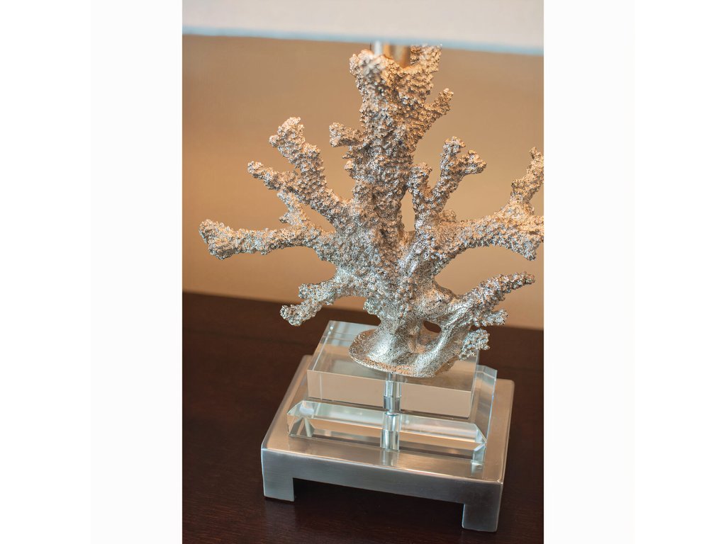 Настольная лампа «Гамильтон» — это воплощение изысканного вкуса и гармоничного сочетания природных форм с современным интерьерным стилем. Основной декоративный элемент лампы представляет собой стилизованную ветвь коралла, отлитую из металла с выразительной фактурой. Поверхность декора покрыта благородным золотисто-шампанским напылением, которое придает изделию легкий блеск и визуальную глубину, делая его настоящим арт-объектом. Основание лампы выполнено из прозрачного акрила, что создаёт эффект легкости и воздушности. Такая конструкция органично смотрится в современных интерьерах и не перегружает пространство. Подставка дополнена устойчивыми металлическими ножками, обеспечивающими надежную фиксацию на поверхности. Абажур лампы изготовлен из высококачественного текстиля белого цвета. Его простая прямоугольная форма удачно контрастирует с динамичной формой кораллового основания, обеспечивая сбалансированный визуальный образ. Свет, проходя через ткань абажура, рассеивается мягко и равномерно, создавая теплую и уютную атмосферу в комнате. Дополнительным акцентом выступает декоративная коралловая фигурка на верхушке абажура, гармонично завершающая композицию. Этот элемент подчеркивает единую стилистическую концепцию и делает дизайн завершённым. Длина провода: 1,4 м. Цвет провода: Прозрачный. Тип переключателя: Вкл. / Выкл. Комплектация лампочками: Нет.