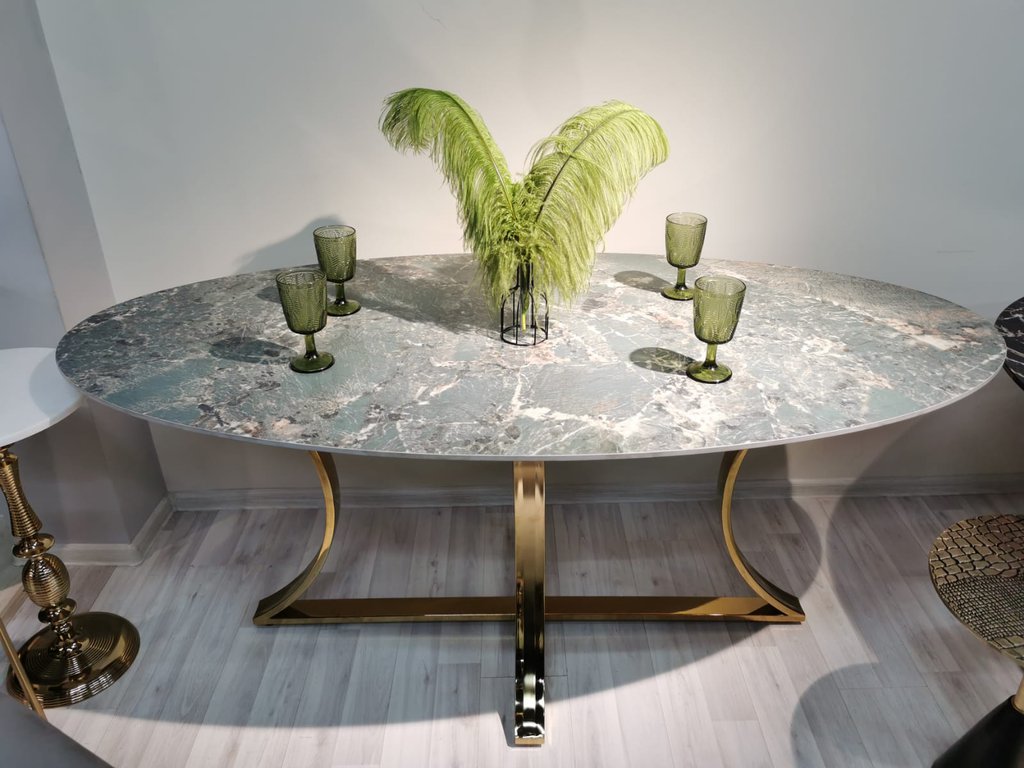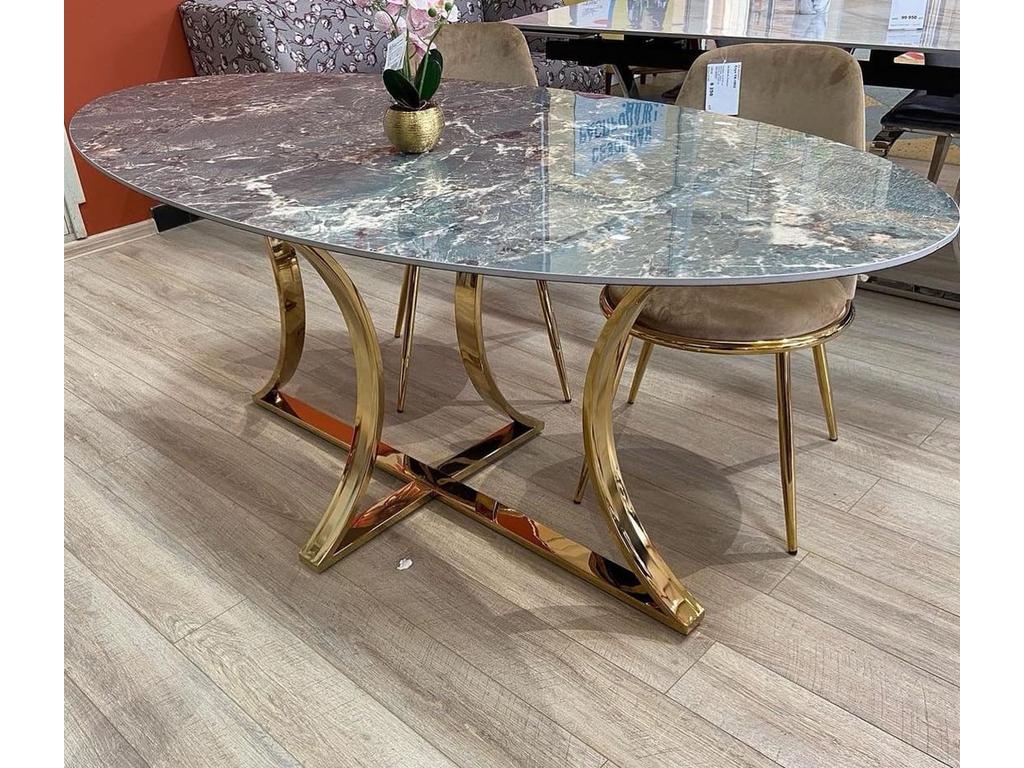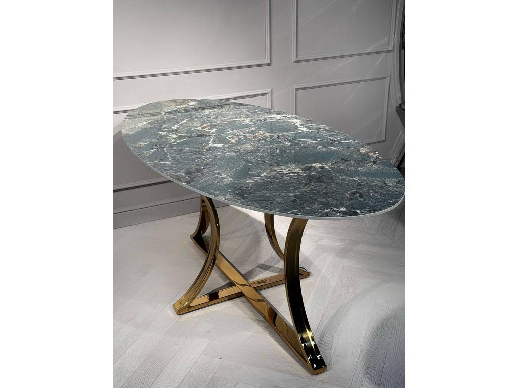 Столешница: керамогранит, цвет: малахитовый мрамор. Основание: нержавеющая сталь, глянцевое золото. Вес нетто 60 кг.