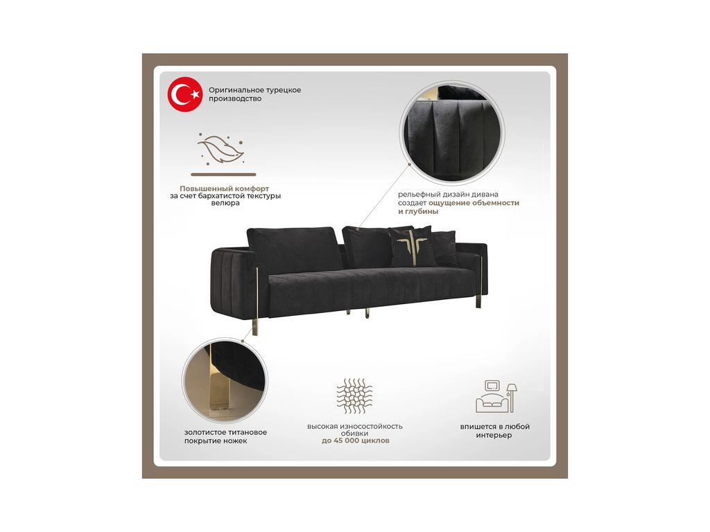 Каркас- фанера и массив бука. Сиденья- губка плотностью 35кг/м3. Верхняя часть- губка плотностью 45кг/м3. Внутренняя часть- губка плотностью 26кг/м3. Под сиденьями используется первоклассный эластичный материал, шириной по 7 см. Для внешнего покрытия используется ткань 350-500 г/м2, и коэфициентом трения между 35000-45000. Гарантия 12 месяцев. Материал: Бук, Фанера, Металл
