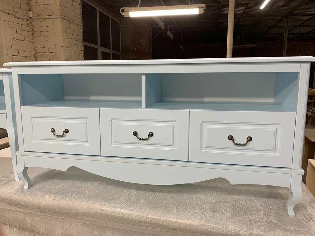 Варианты отделки: Белый и Ваниль, золотая патина. Тумба с открытими полками и выдвижными ящиками.