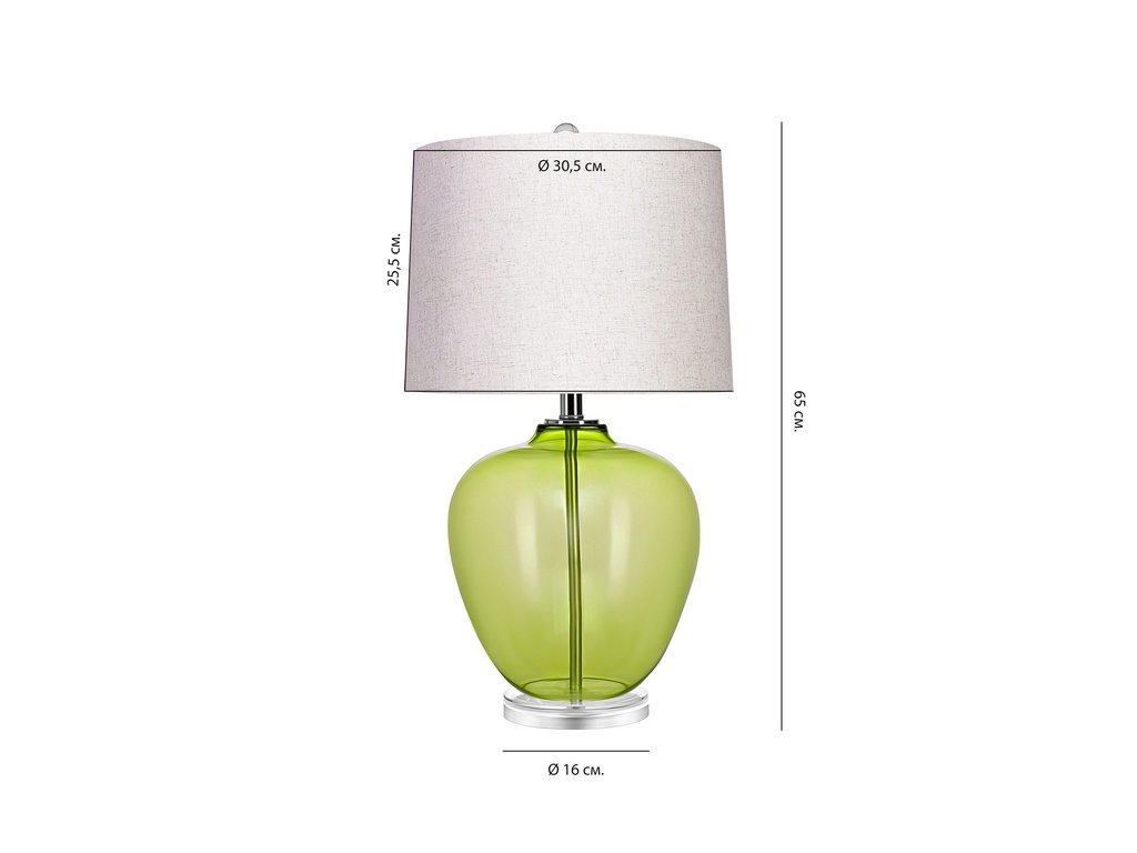 Светлый и яркий, летний зеленый оттенок настольной лампы “Хизер” привнесет свежесть и уют в вашу комнату. Основание лампы изготовлено из прочного и прозрачного стекла, которое придает ей роскошный и изысканный вид. Стеклянное основание будет преломлять свет, создавая красивые оттенки и отражения. Эта настольная лампа идеально подходит для использования в спальне, гостиной, кабинете или студии. Она станет прекрасным подарком для себя или для ваших близких. Материал: Фурнитура – Металл. Колба – Стекло. Абажур – Ткань (Лён). Тип цоколя: E27. Мощность лампы: 60 Вт. Степень защиты: IP20. Длина провода: 1,4 м. Цвет провода: Прозрачный. Расположение переключателя: Провод. Тип переключателя: Вкл. / Выкл. Комплектация лампочками: Нет. Вес: 2.8 кг.
