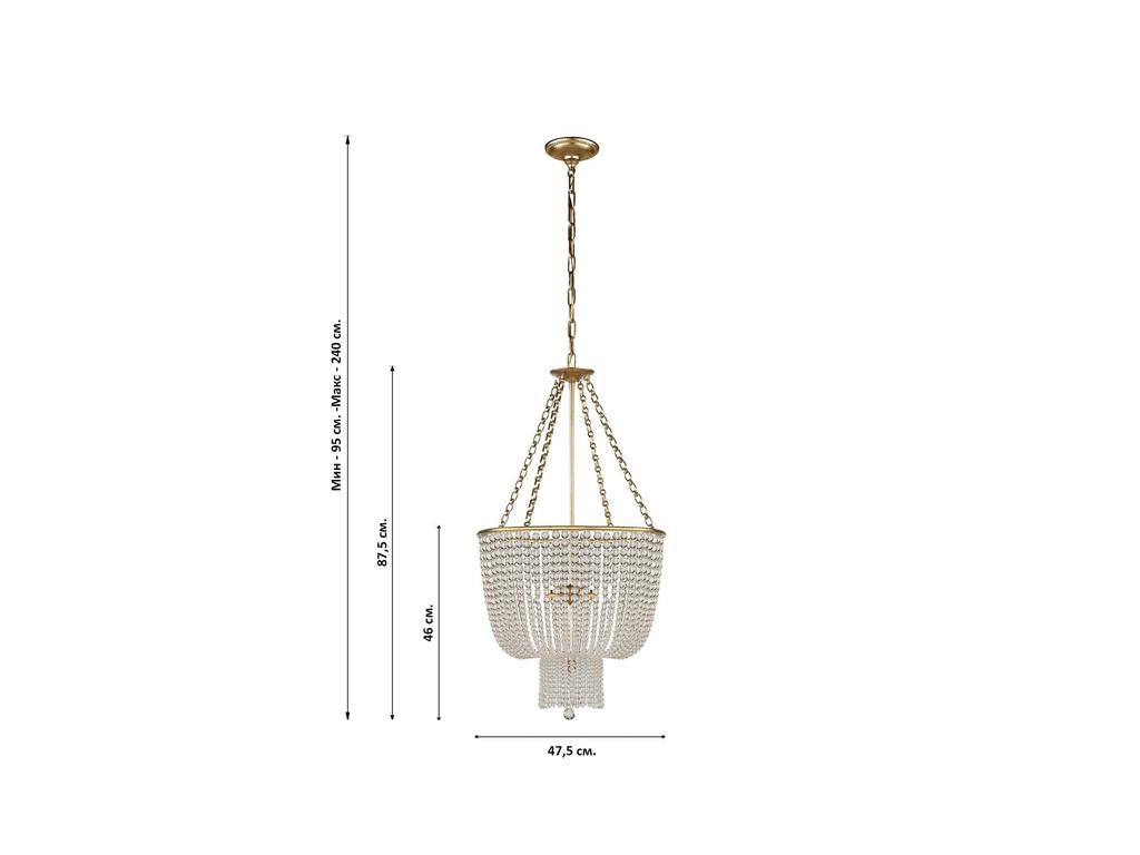 Длина провода: 140 см. Количество ламп: 4 шт. Тип цоколя: E14. Степень защиты: IP20. Чаша потолочная: 2,5 см х 13 см. Комплектация лампочками: Нет. Требуется сборка: Нет. Вес люстры: 12,2 кг.