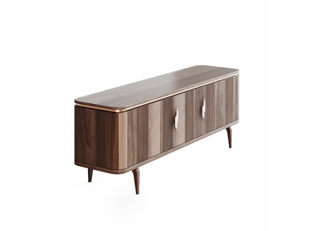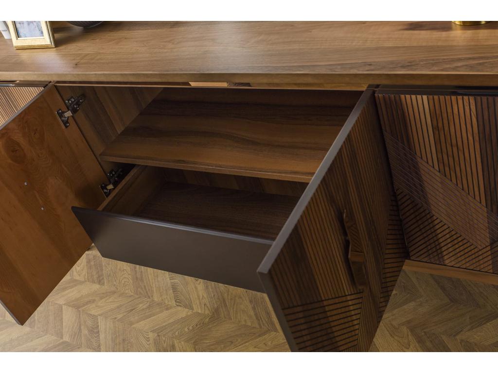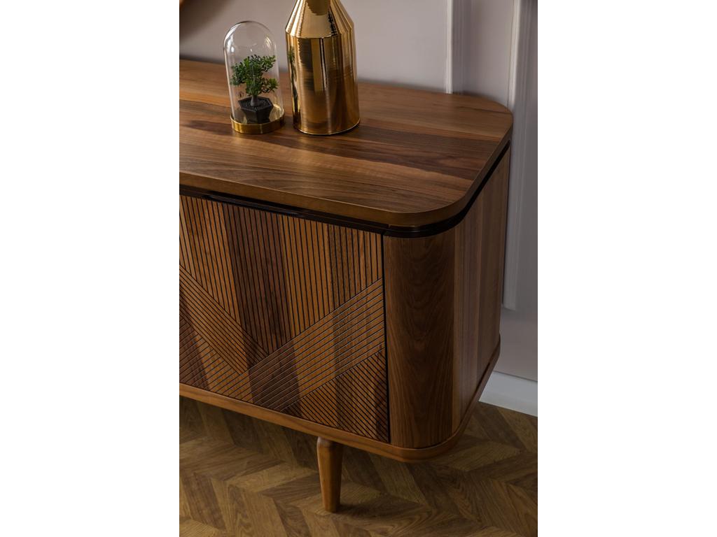Комод Ronda выделяется превосходным качеством используемых материалов и оригинальным рустикальным стилем. Фасад с необычным узором из пересекающихся линий сразу привлекает взгляд. Металлическая фурнитура золотистых оттенков гармонично дополняет шпон благородной ореховой древесины. Прямые линии массивных буковых ножек добавляют обстановке изысканности. Дизайнерское зеркало в раме, подобранной под общий тон, завершает образ.