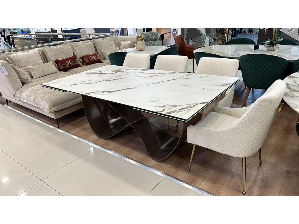 Роскошный обеденный стол с керамической столешницей 3 мм на стеклянной подложке 8 мм. Брашированная металлическая опора в цвете бронза, золотая пудра