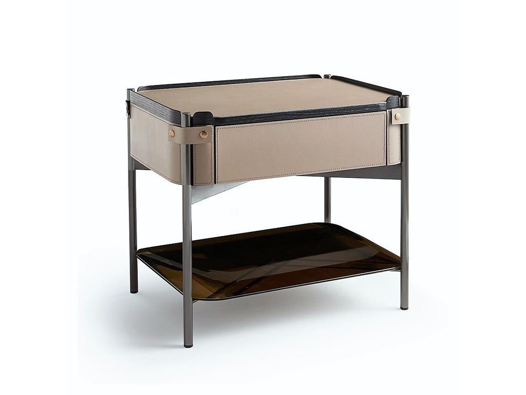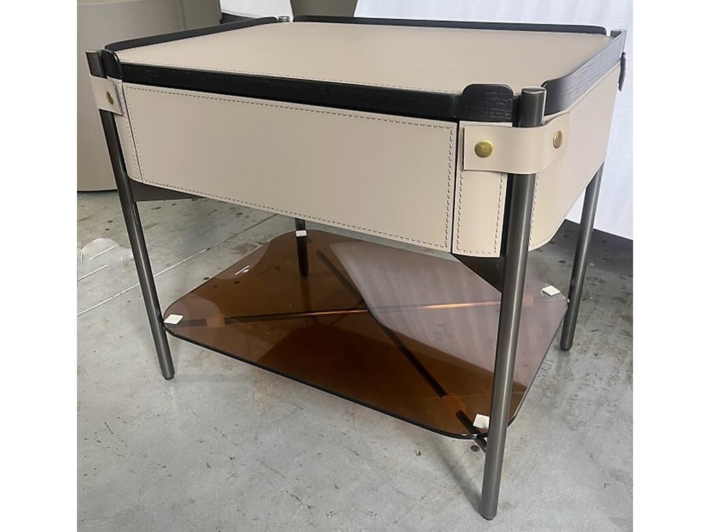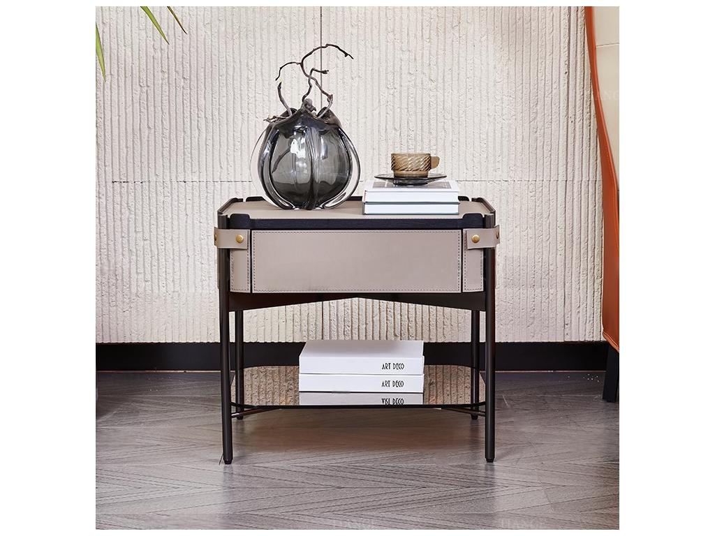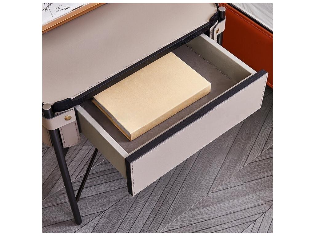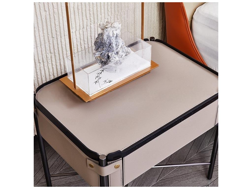 Тумба выполнена из МДФ с отделкой из экокожи серо-бежевого цвета.