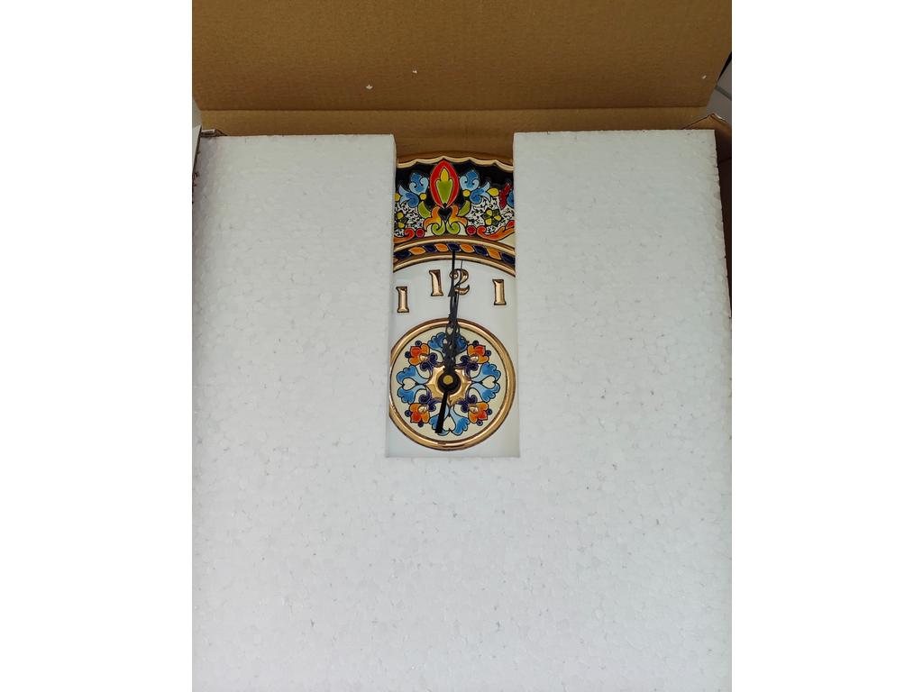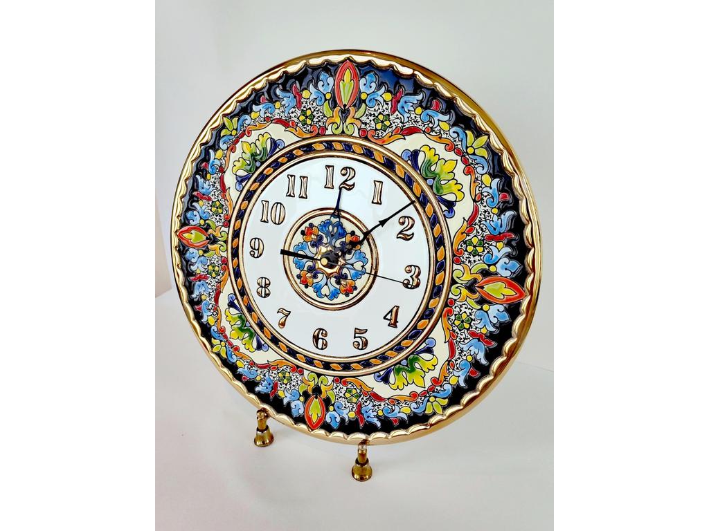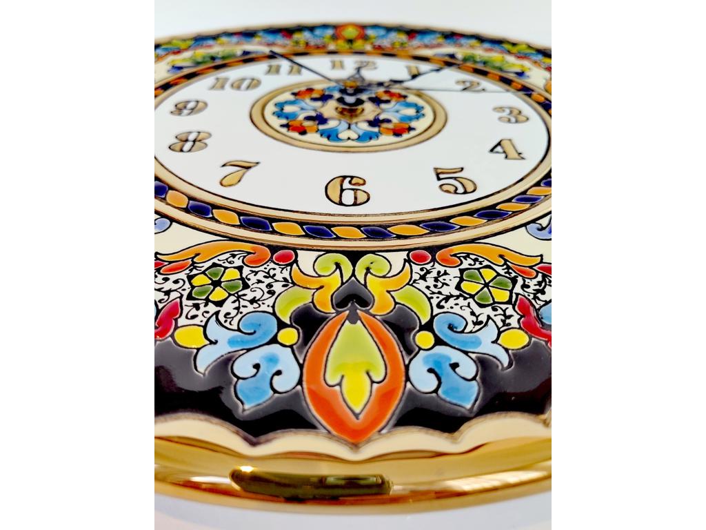 Настенные часы из вулканической керамики. Эмаль, золото 24 карата, немецкий часовой механизм. Производство Испании. Ручная работа. Выполнены в технике конца XIV века Cuerda Seca (метод сухой веревки). Каждое изделие уникально. Часы могут подвешиваться на стену, а при наличии подставки, выполнять функцию настольных часов.