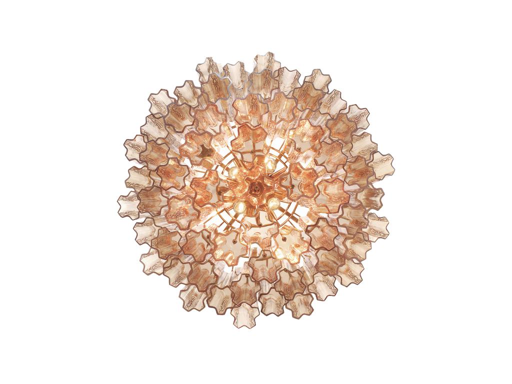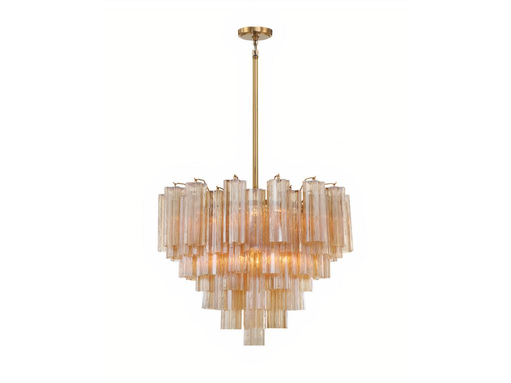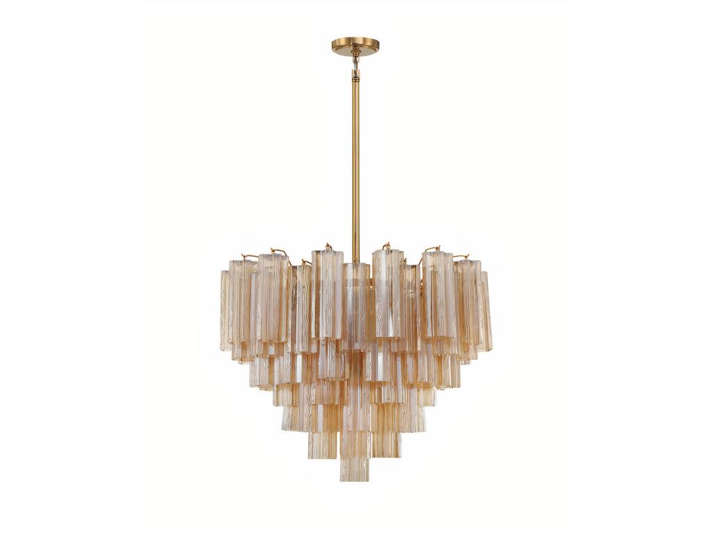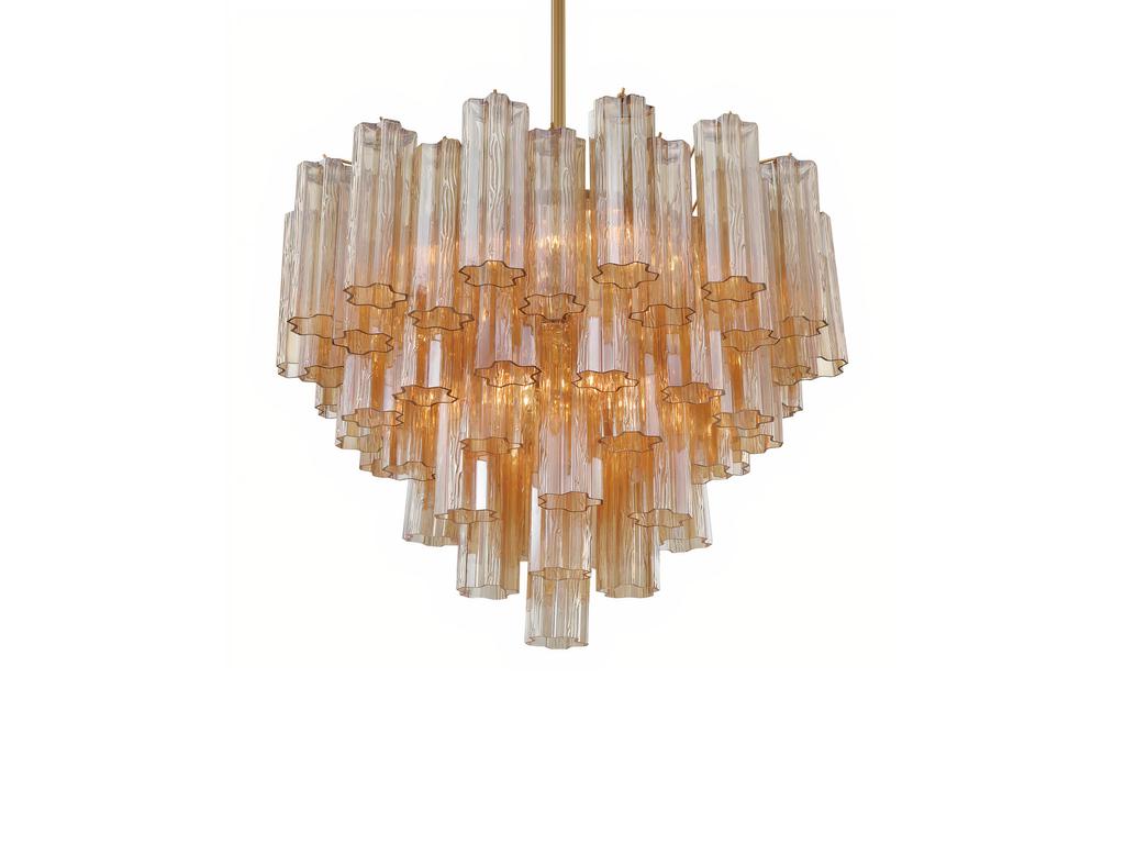 Люстра “Толбот” с янтарным стеклом, представлена в изысканном металлическом каркасе с покрытием в цветовой гамме латунь, что придает ей стильный и утонченный вид. Уникальный дизайн светильника включает прозрачные ярусы фактурных стеклянных трубок “Трончи”. Доступны различные варианты окраски стекла: прозрачное, янтарное, дымчатое и белое, а также потрясающий осенний оттенок “Autumn“, в котором эффектно сочетаются стеклянные элементы в цветах янтарь, прозрачный. Размеры светильника: 56.5 см. х 66.0 см. х 66.0 см. Мин. – Макс. Высота: 62 см. – 152 см. Материалы светильника: Основание – Металл. Плафоны – Стекло. Количество ламп: 12 шт. Вес люстры: 23.5 кг.