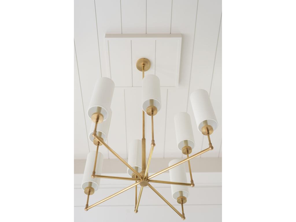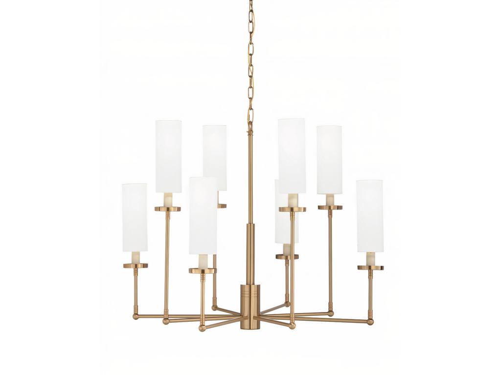 Золотая люстра “Новара” – это элегантное и современное осветительное решение, которое станет изысканным украшением любого интерьера. Двухуровневая конструкция люстры выполнена в цветовой гамме – латунь, что придает ей благородный и роскошный вид. Люстра оснащена восемью лампами, каждая из которых дополнена белыми тканевыми абажурами цилиндрической формы. Материалы люстры: Основание – Металл. Абажуры – Ткань (Хлопок). Комплектация лампочками: Нет. Вес: 5,2 кг.