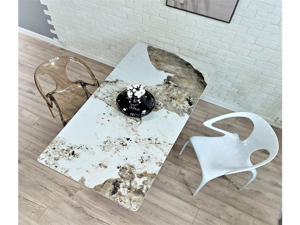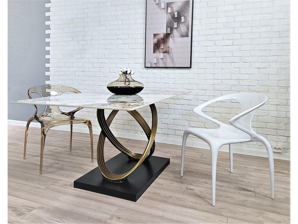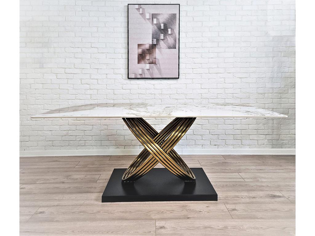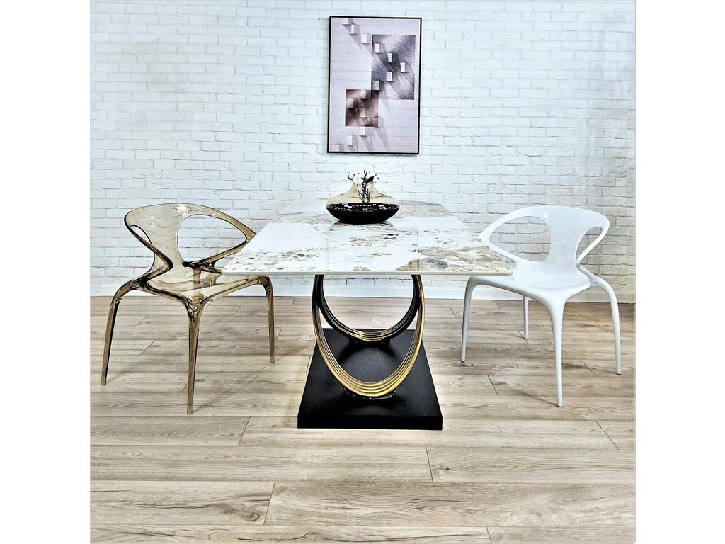 Стол с прямоугольной столешницей, созданный в современном стиле – будет главным эстетическим акцентом в вашей гостиной или столовой. Изящная геометрия двух полукруглых опор наполнена элегантностью и подчеркивают особую композицию стола в сочетание с безупречной столешницей из керамогранита добавит в интерьер нотки минималистичной роскоши. Основание выполнено из полированной нержавеющей стали, цвет золото браш. Подставка под основанием из металла, цвет черный. Керамогранит глянцевый с рисунком Pandora. Стол комфортно позволит разместить 6 персон. Требуется сборка.
