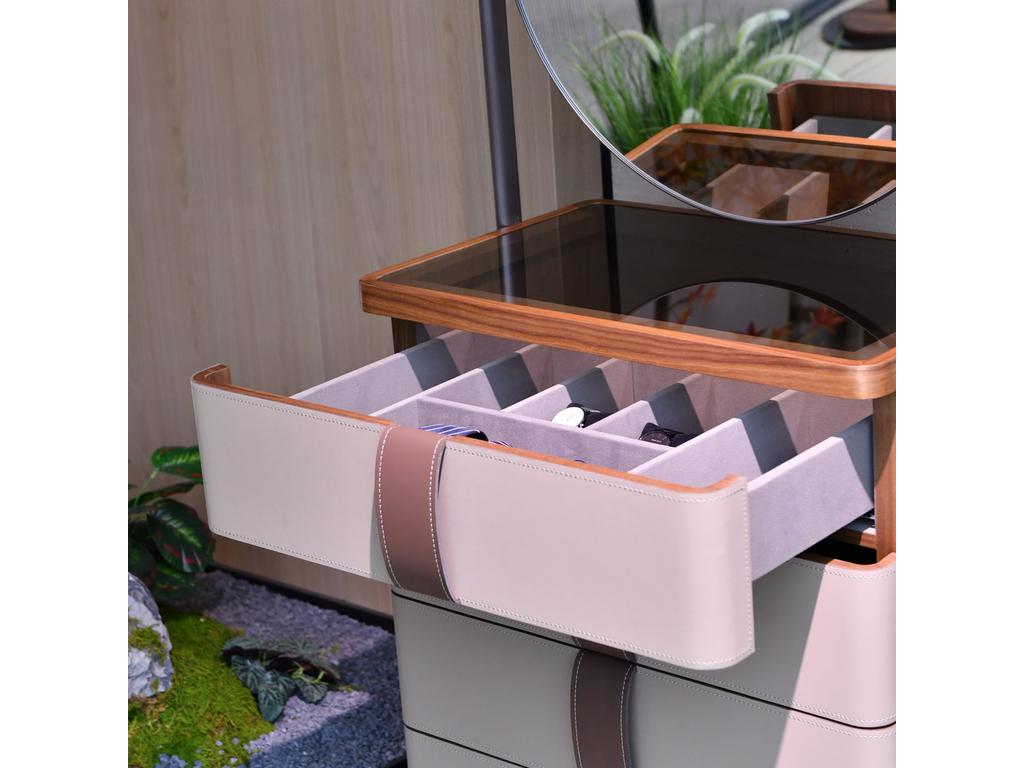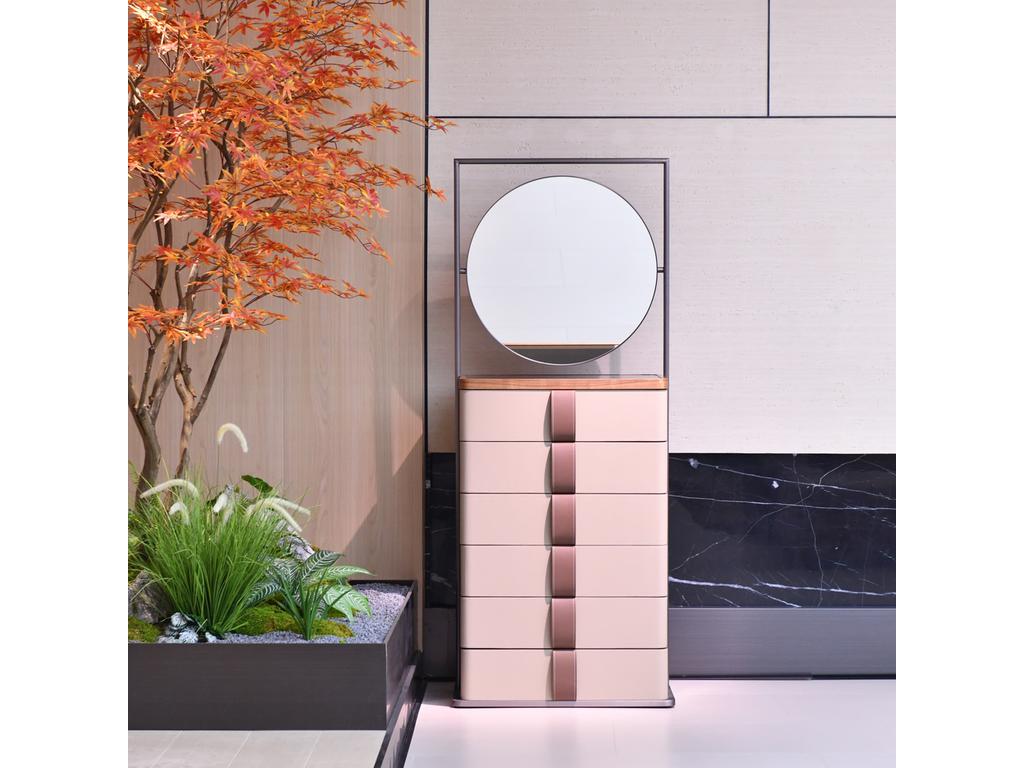 Современный и лаконичный комод создаст ощущение легкости и утонченной элегантности в спальне, гостиной или прихожей. Внимание к деталям, особый шарм ручной работы и удобное место для продуманного хранения делают комод подходящим для разных стилей интерьера. Высокий комод с шестью ящиками и фасадами из экокожи. Каркас выполнен из МДФ, облицован шпоном и массивом ореха. Круглое поворотное зеркало.