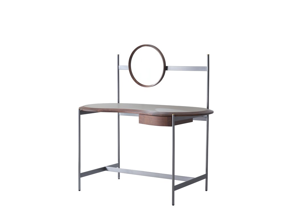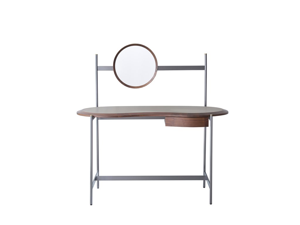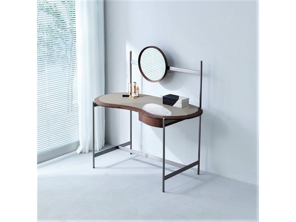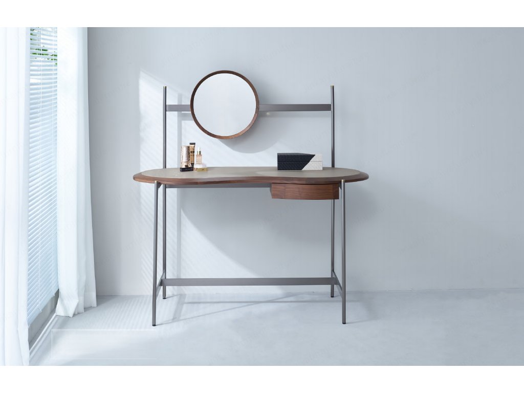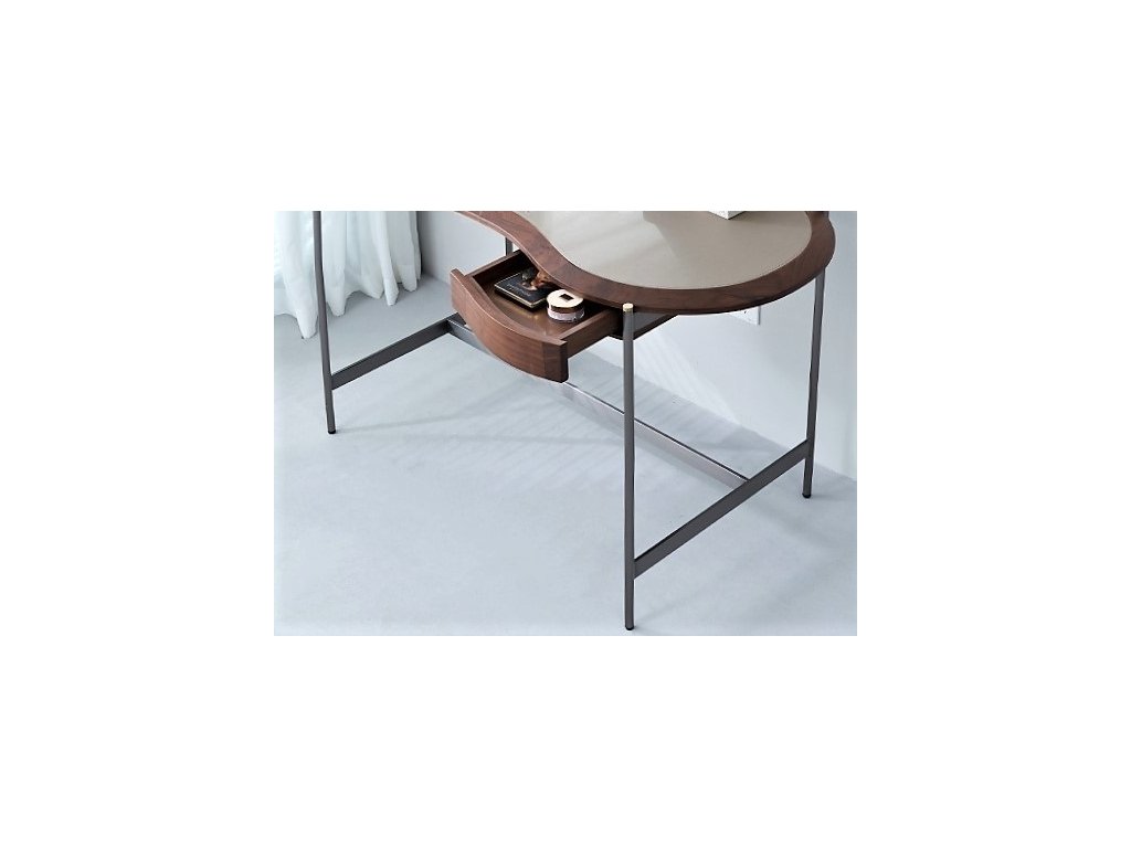 Элегантная консоль может служить туалетным или письменным столиком. Мягкие формы создают романтический силуэт, который становится центром внимания в комнате. Отделка выполнена из натурального шпона, цвет орех. Верх столешницы из экокожи серо-бежевого цвета. Металлическое основание в цвете серый сатин.