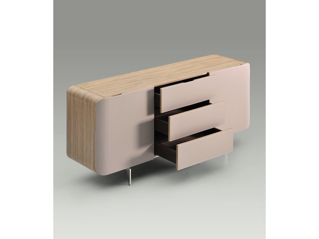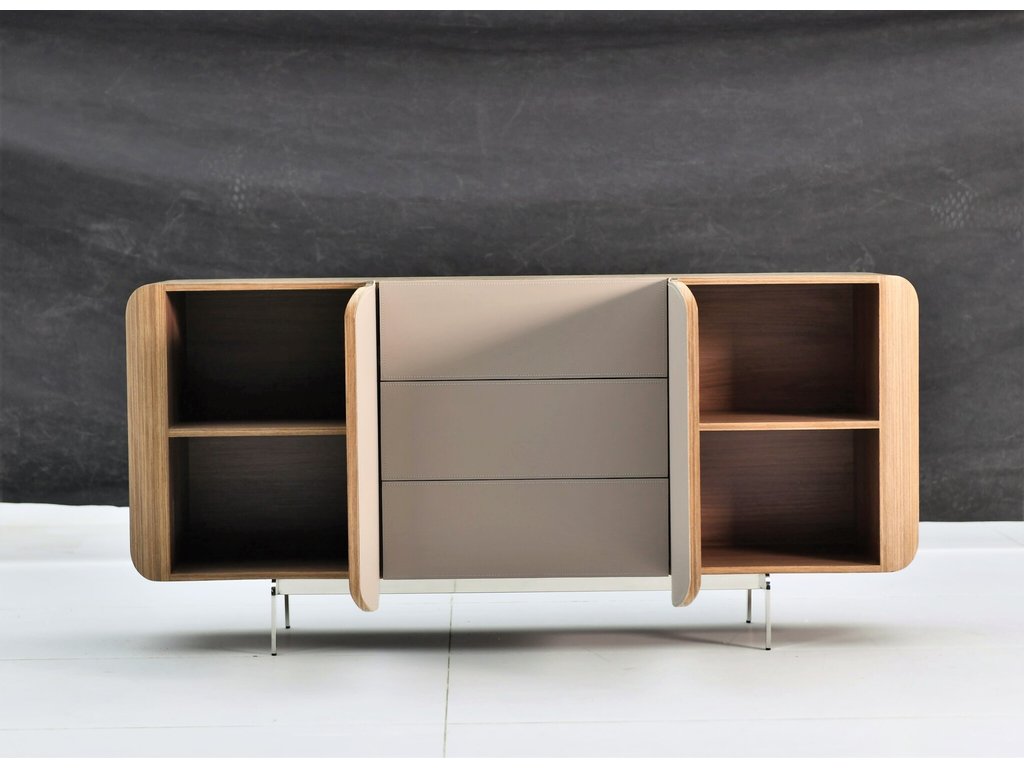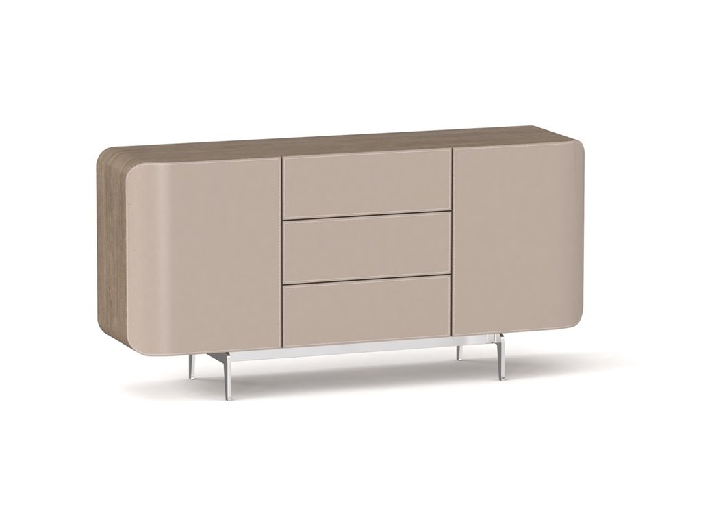 Комод в отделке из экокожи и шпона американского ореха. Ножки из металла. Цвет сатин. Комод представляет собой комбинацию распашных дверей с выдвижными ящиками. Ручки интегрированы в фасад дверей. Три ящика со скрытой системой крепления и доводчиками.