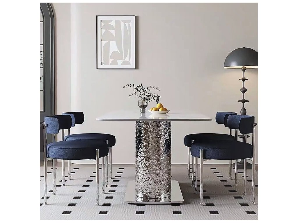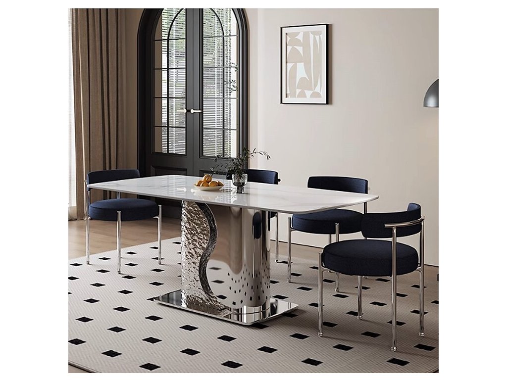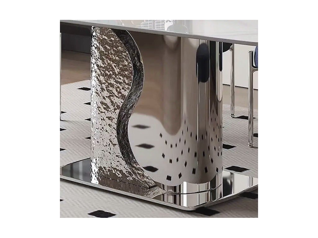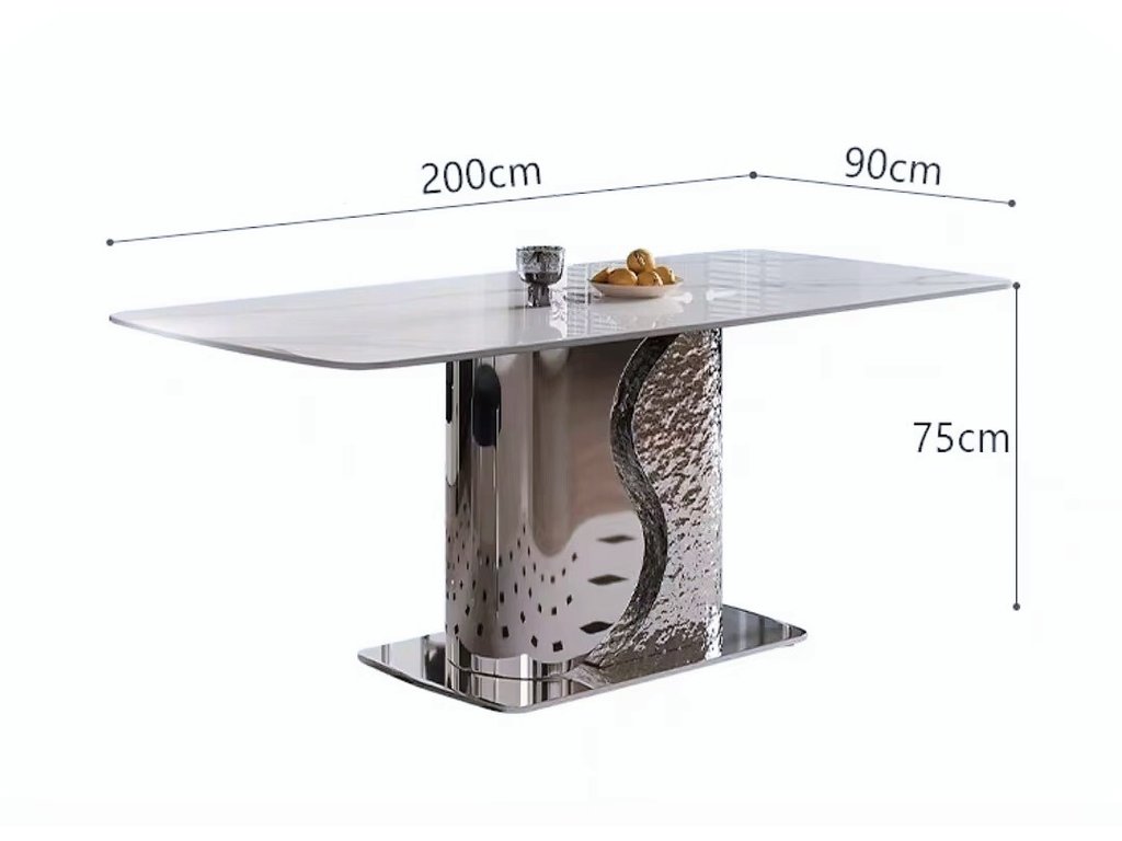 Стол с прямоугольной столешницей, созданный в современном стиле – будет главным эстетическим акцентом в вашей гостиной или столовой. Основание выполнено из полированной нержавеющей стали. Керамогранит глянцевый с рисунком Mountain White. Стол комфортно позволит разместить 6 персон.