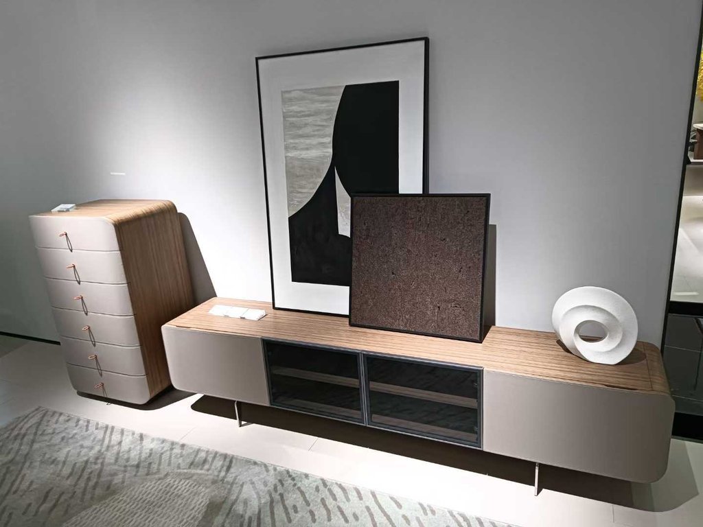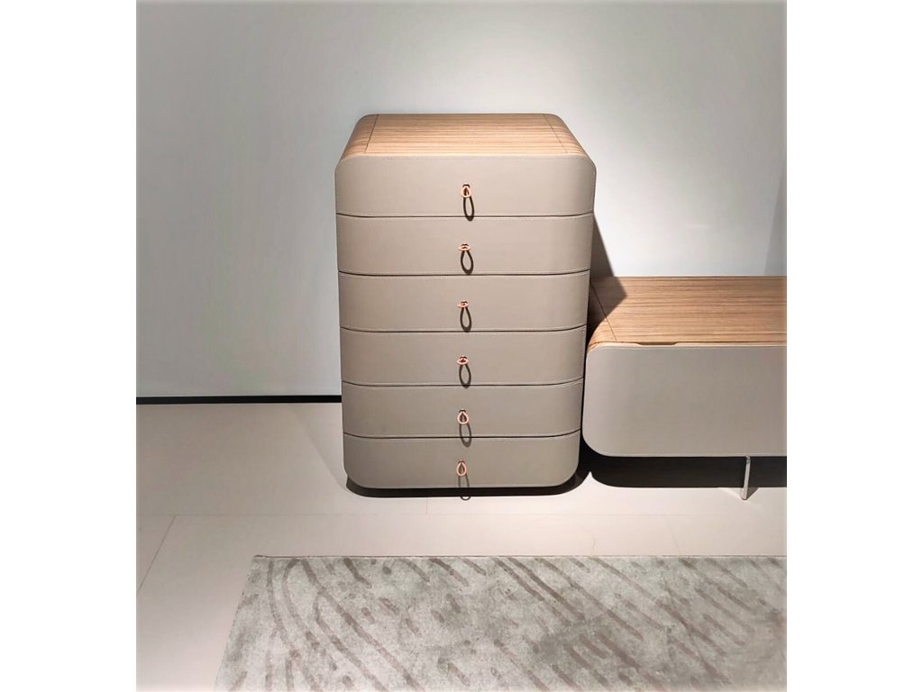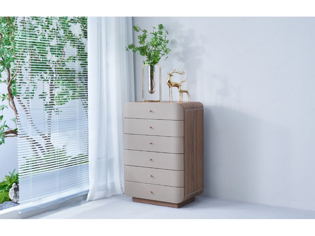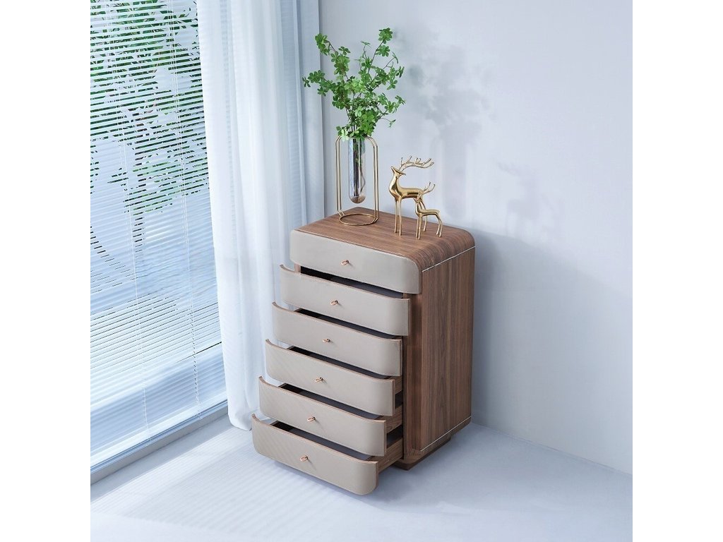 Новинка сезона — элегантный комод из экокожи, гармонично вписывающийся в интерьер гостиной, спальни либо офиса. Изящная форма и вместительные ящики обеспечивают комфортное хранение различных предметов и аксессуаров. Высокий комод с шестью ящиками в отделке из экокожи бежево-серого цвета и шпона американского ореха. Выдвижная система ящиков с плавным ходом и доводчиками.