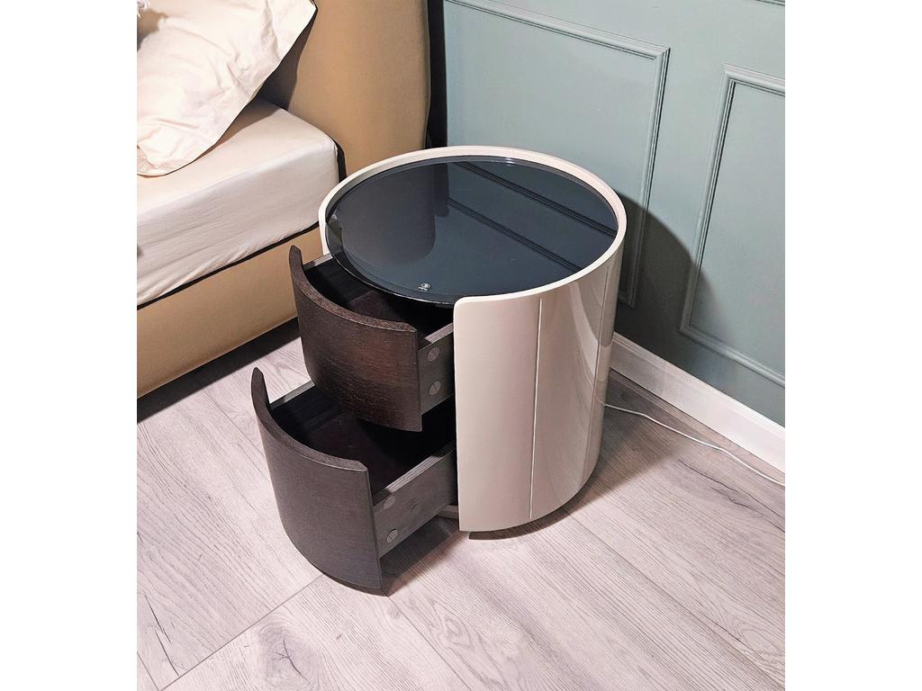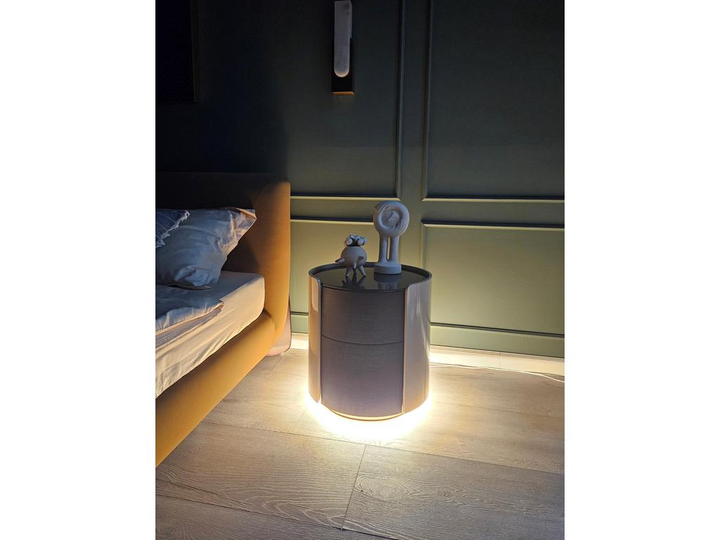 Изящная прикроватная тумба выполнена в современном минималистичном стиле. Тумба оборудована светодиодной лентой с датчиком движения, который автоматически включает мягкую подсветку при приближении, обеспечивая комфортное использование в ночное время. Свет автоматически отключается через 30 сек. Работает от сети 220 вольт. Цветовая температура 2700 К. Два выдвижных ящика открываются легким нажатием (Push To Open). Выдвижная система со скрытым креплением. На дне ящиков покрытие из бархата, цвет - темный шоколад. Внутренние размеры верхнего ящика: