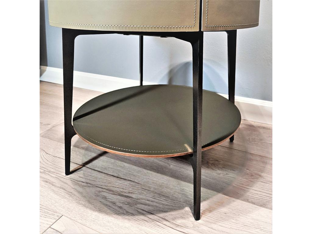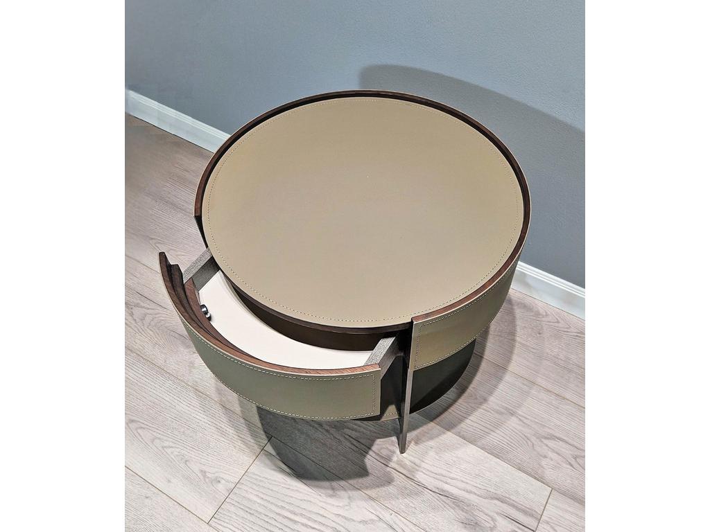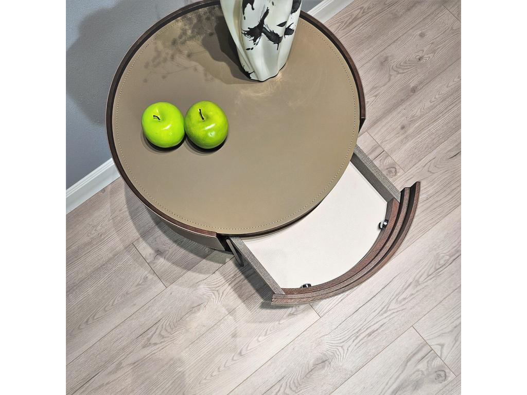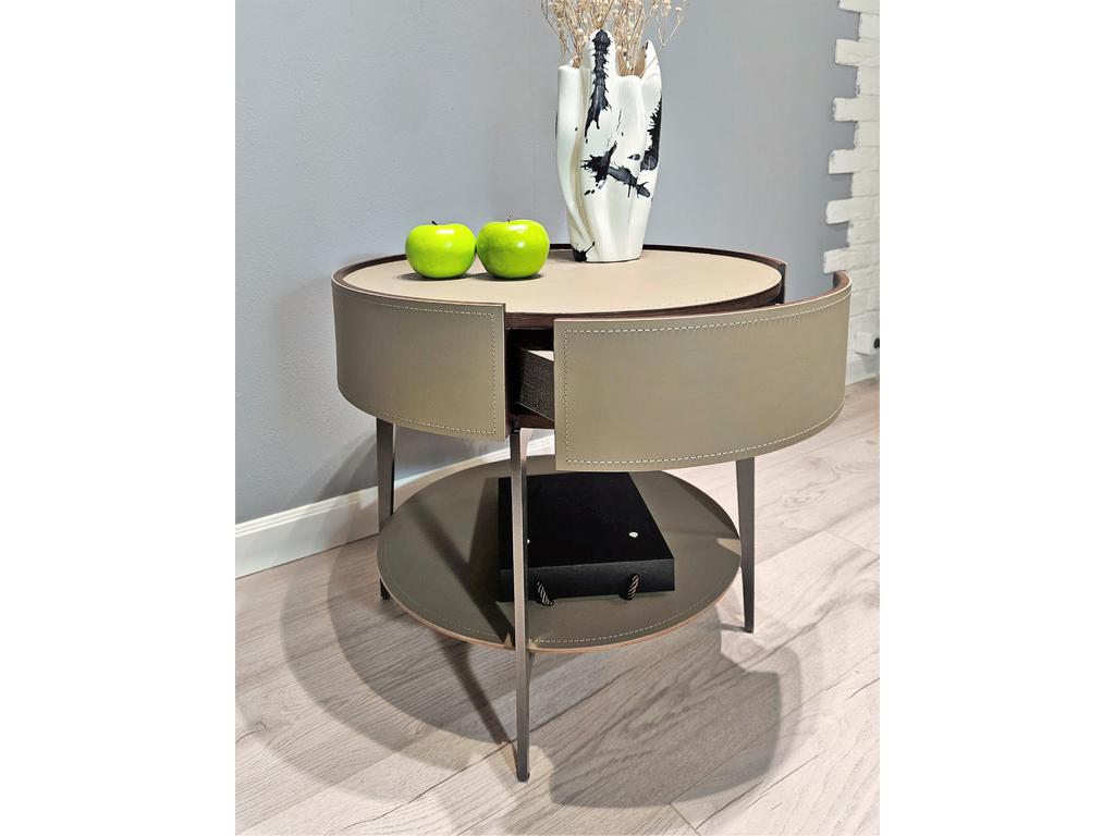 Современная дизайнерская тумба будет одинаково хорошо смотреться в вашей гостиной в качестве приставного столика или в вашей спальне в качестве прикроватной тумбы. Тумба представляет собой комбинацию открытого отделения в сочетании с выдвижным ящиком. Отделка тумбы выполнена из экокожи (цвет серо-бежевый) и шпона (цвет орех). Изящные металлические ножки темно-серого цвета, покрытие матовое. Высота ножек 12 см. Расстояние между ножками 30 см. Небольшое углубление столешницы не позволит предметам падать. Ручка интегрирована в нижнюю часть фасада ящика. Выдвижная система со скрытым креплением и доводчиком. Высота открытого отделения 24 см.