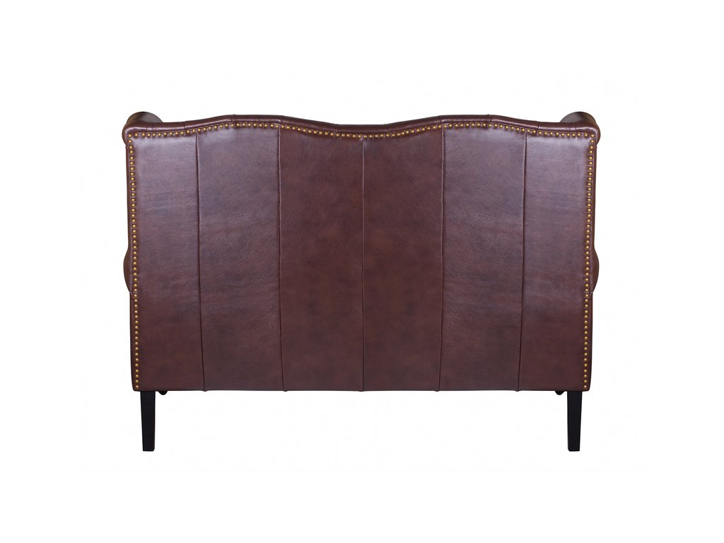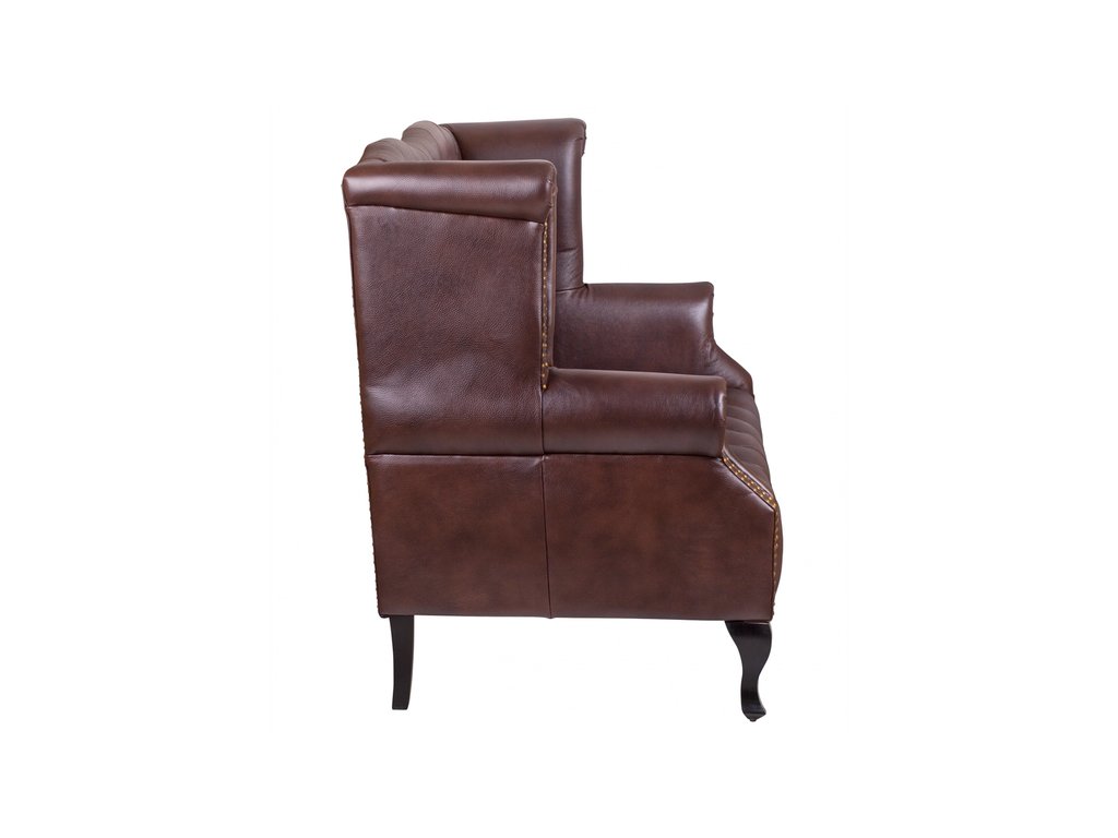 Коричневый кожаный диван из букового массива располагается на четырех коротких ножках черного цвета: прямых задних и эффектно изогнутых – передних. Спинка с волнообразным верхом слегка загибается по бокам и соединяется с мягкими подлокотниками. Поверхность дивана украшена стяжкой и декоративными заклепками по периметру. Глубина места для сидения 64 см. Сборка не требуется. Вес 47 кг.