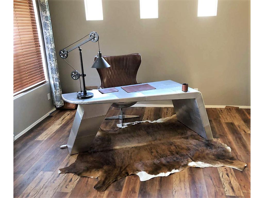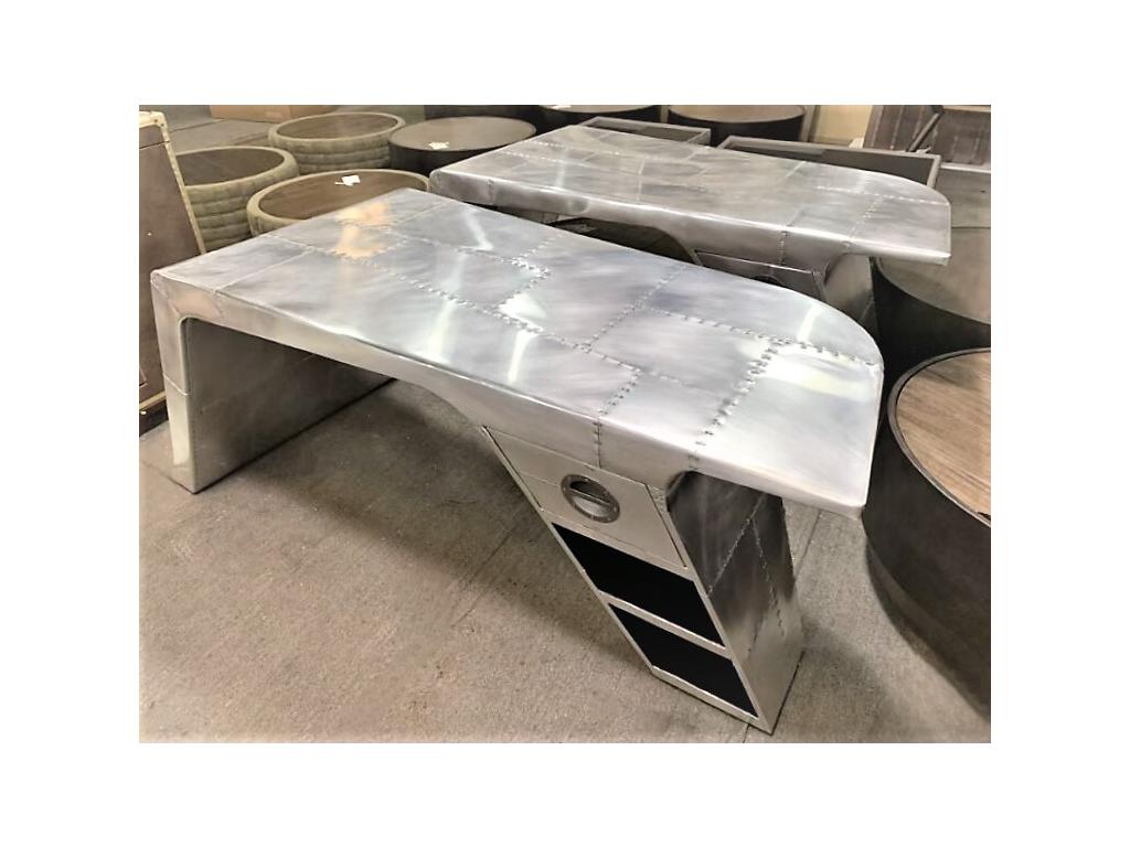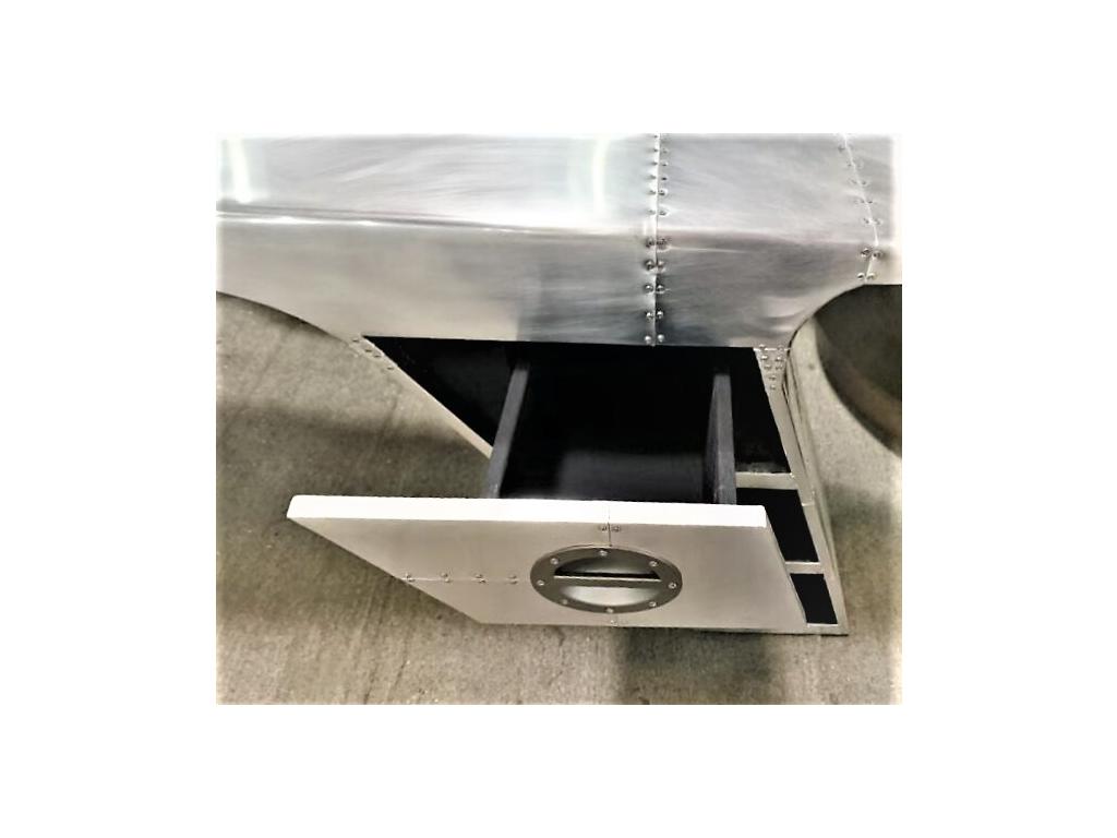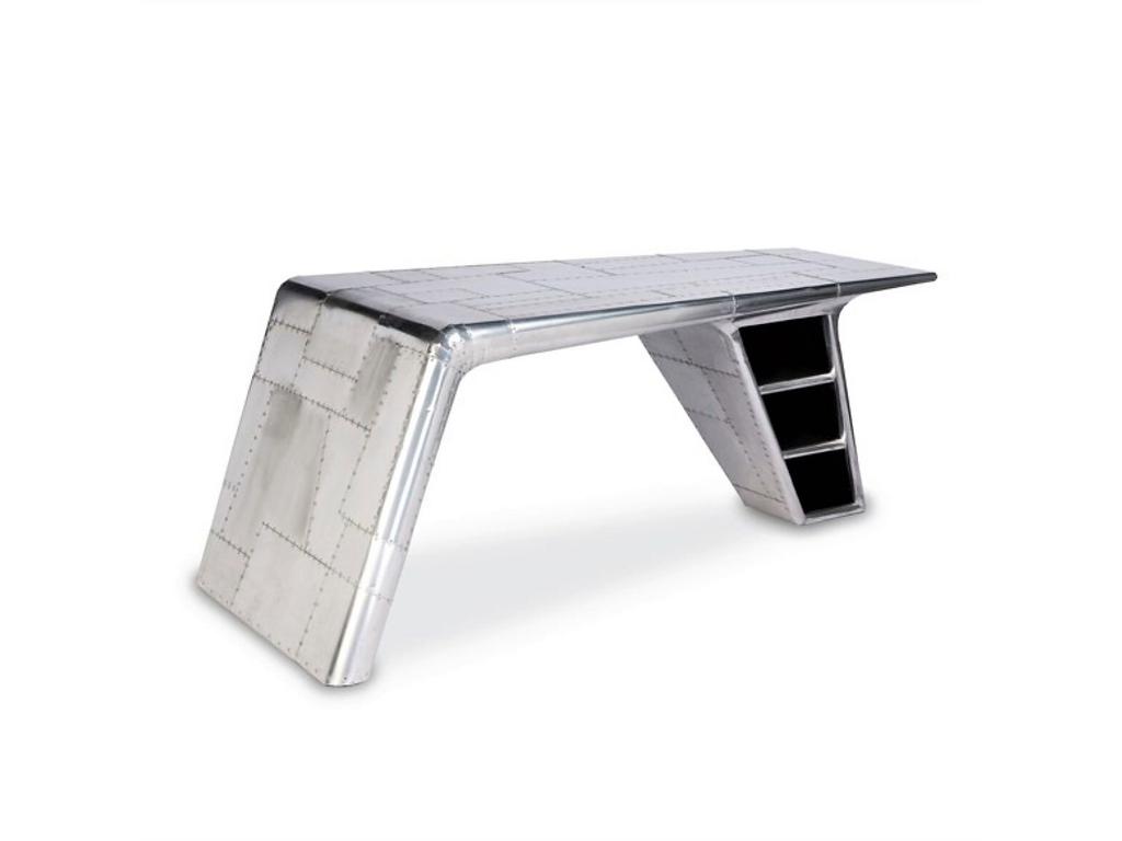 Письменный стол Aviator Desk – это сочетание стиля и функциональности. Изготовленный из металла серебристого цвета, этот предмет мебели идеально подчеркнет современный интерьер вашего кабинета или офиса в стиле хай-тек, авиатора или лофта. Стол представлен в отделке из алюминиевых листов с заклепками. Ручная работа. Стол имеет две металлические опоры, которые обеспечивают устойчивость и долговечность конструкции. В одной опоре установлен выдвижной ящик и два открытых отделения.