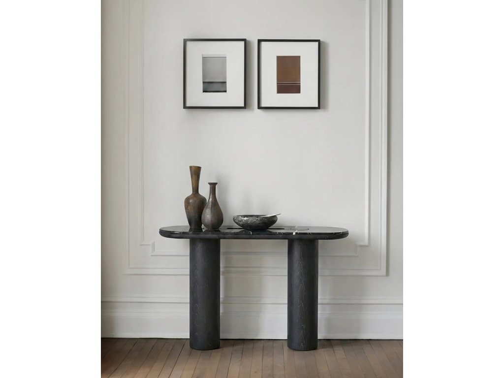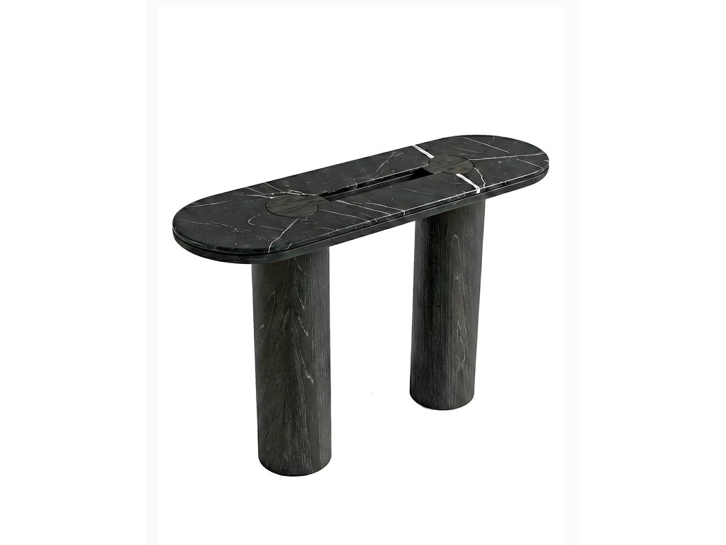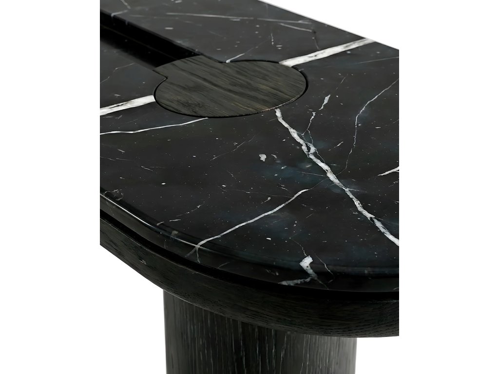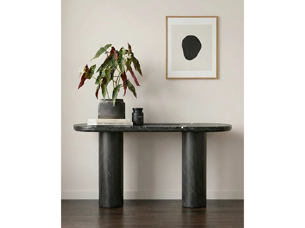 Чёрная консоль “Свэн” – это изысканный предмет мебели. Столешница выполнена из черного мрамора, а её овальная вытянутая форма состоит из нескольких сегментов, соединённых декоративными вставками. Консоль выполнена в современном стиле с элементами ар-деко, что делает её эффектным акцентом как в классических, так и в минималистичных интерьерах. Благодаря изящным пропорциям она идеально подходит для прихожей, а также для зонирования пространства в гостиной. Требуется сборка. Вес 36,3 кг.