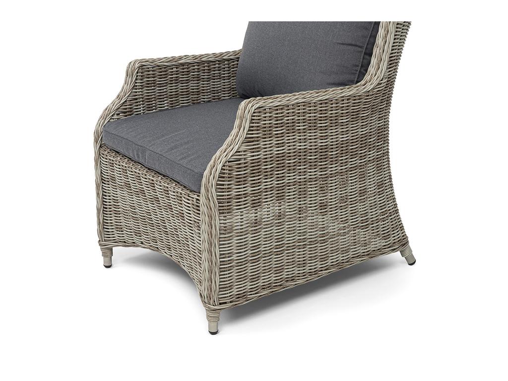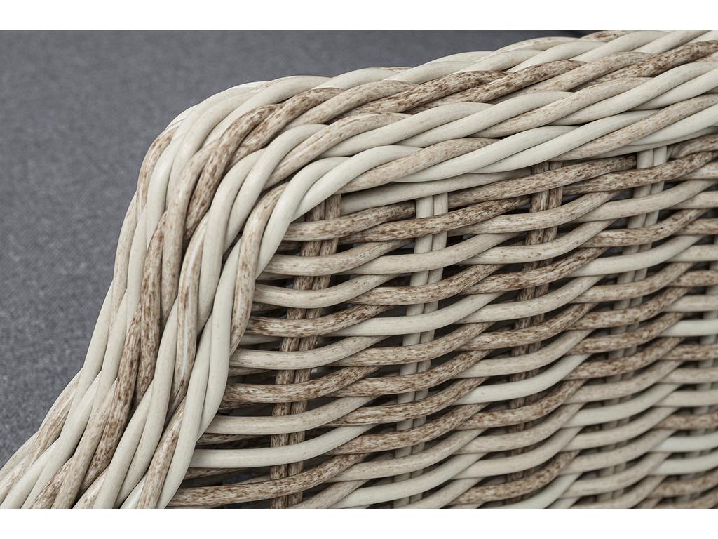 Стул «Неаполь» имеет практичные подлокотники для удобного размещения во время отдыха. Спинка и подлокотники имеют планые линии, благодаря своим закругленным формам. Каркас мебели сделан из алюминия. Присутствует ручное круглое плетение, при изготовлении которого используется искусственный ротанг. Представлено в бежевом цвете. Плетенный стул дополняют мягкие подушки. Они выполнены в серо-коричневом оттенке. Пошиты изделия из плотного полиэстера 230гр/м2. Ткань предварительно обрабатывается влагоотталкивающей пропиткой. Вес 21 кг.