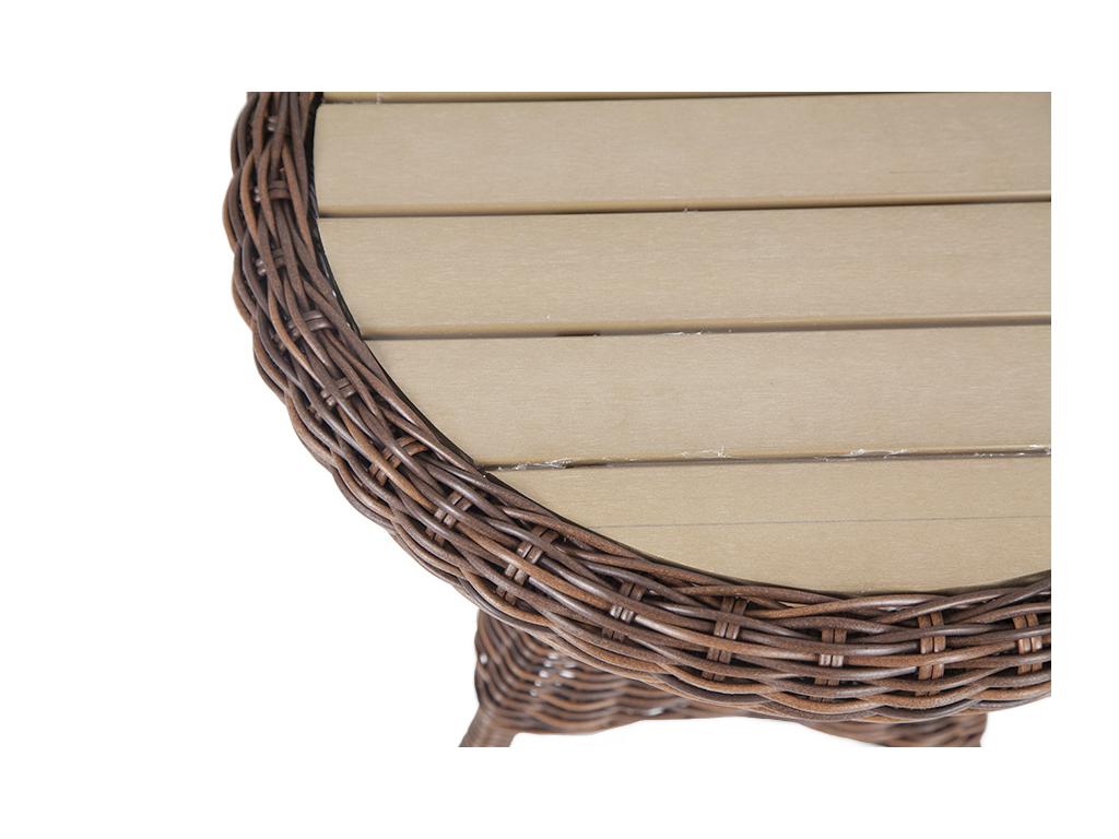 Столик «Равенна» может использоваться как в роли кофейного, так и в качестве детского обеденного стола, в комплект к которому подходят детские кресла из этой серии. Столик располагает прочным каркасом, который изготовлен из качественного алюминия, отвечающий за надежное расположение конструкции. Весь каркас оплетен вручную круглым искусственным ротангом коричневого цвета. Рабочая поверхность столика выполнена из древесно-полимерного композита (ДПК). Материал обладает высокой износостойкостью и прочностью в ходе эксплуатации. Вес 7,5 кг.